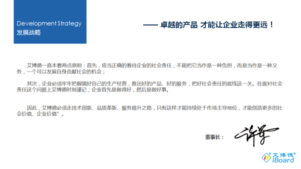 公司成立於2006年,擁有10年教育信息(xī)化行業經驗;是致力(lì)於開發人機交互類(lèi)高科技產品,專(zhuān)業從事提供(gòng)智慧教育整(zhěng)體解決(jué)方案、課堂互動及(jí)電子白板軟(ruǎn)件及觸摸液晶(jīng)屏、交互式(shì)電子白板、激光投影機、多媒體教學一體機(jī)、液晶觸摸一體機等具有健全的開發、生產管理體係和完善的銷售(shòu)、服務機構,是集科、工、貿為一體的國家(jiā)高新技術企業(yè)和重點軟件企(qǐ)業。