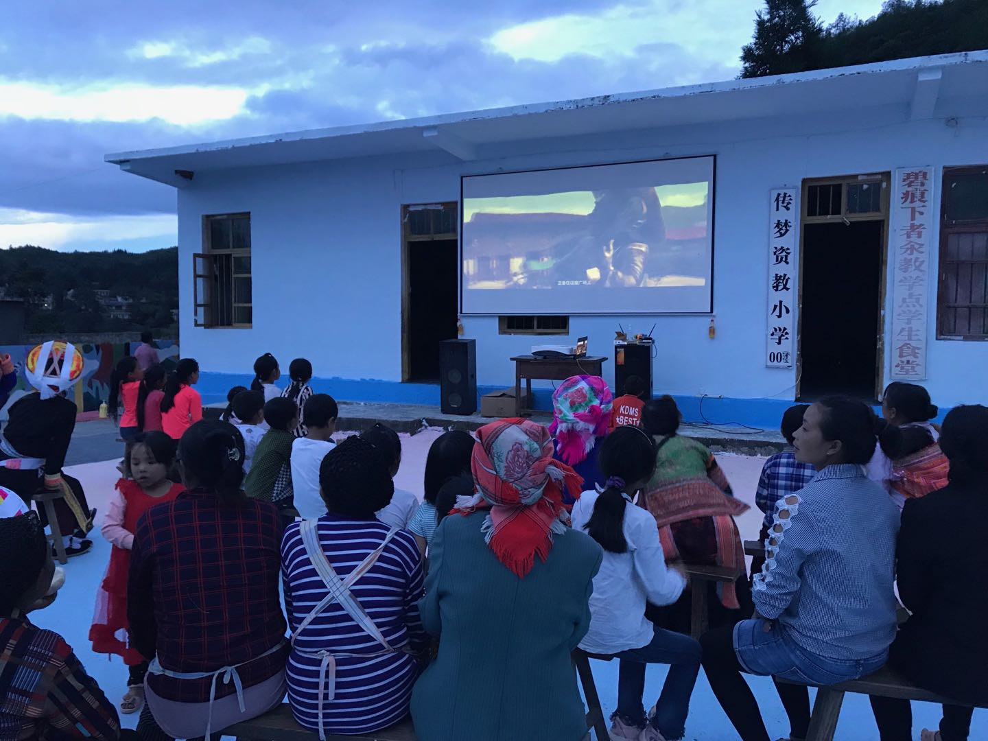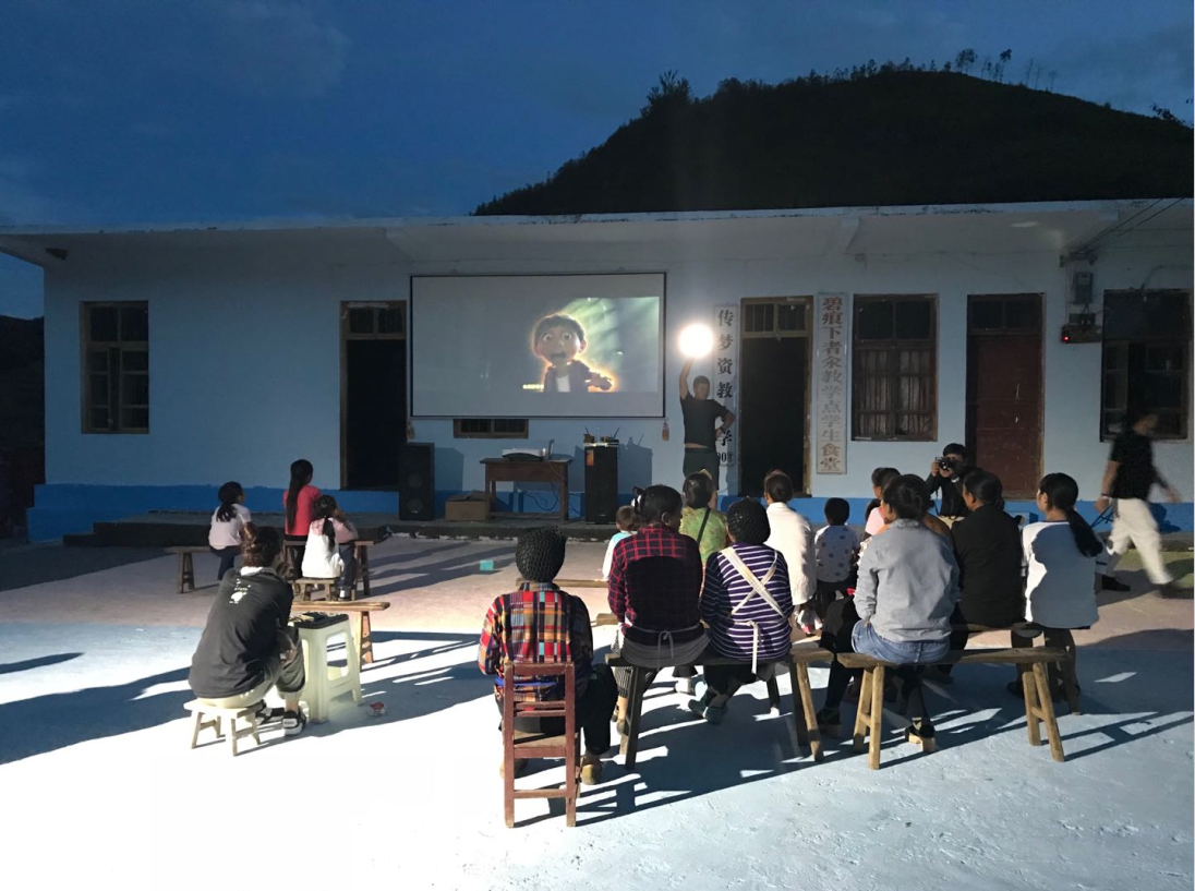 傍晚時分,天色逐漸昏暗,但是孩子與村民(mín)的熱(rè)情還沒有退(tuì)去。借著音(yīn)樂會的餘溫,我們為大家組織了一場露天電影(yǐng),一部(bù)《尋夢環遊記》帶著孩子們的夢想,飛向遠方。