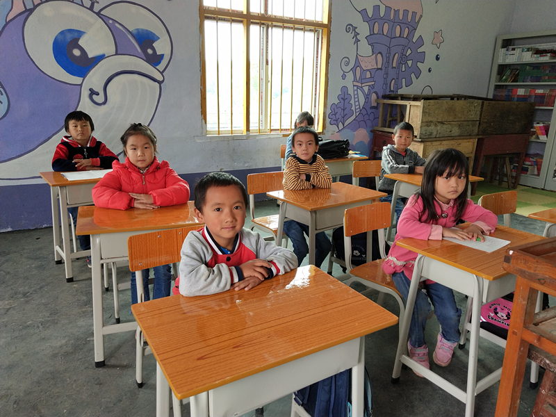 在煥然一新的教室裏用上嶄新(xīn)的桌椅,孩子們的臉上露出了開心的笑容。
