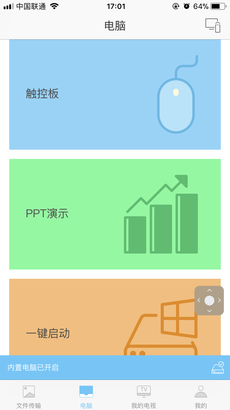 通(tōng)過一體機內置的WiFi熱點,把(bǎ)手機上的鯤鵬軟件與一體機進行連接之後,就可以對(duì)一體機進行操控了。下麵我就為大家簡單介紹一下幾個主要(yào)功能: