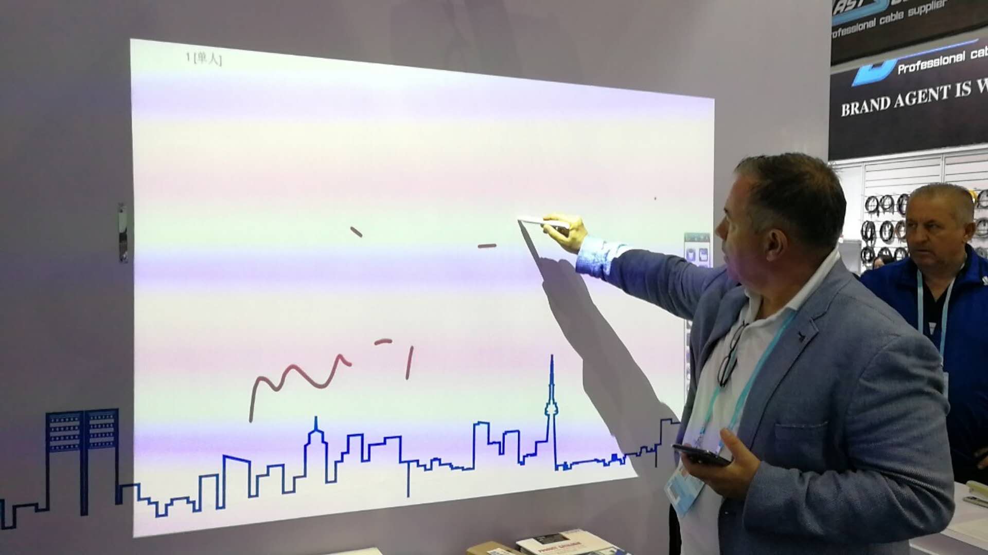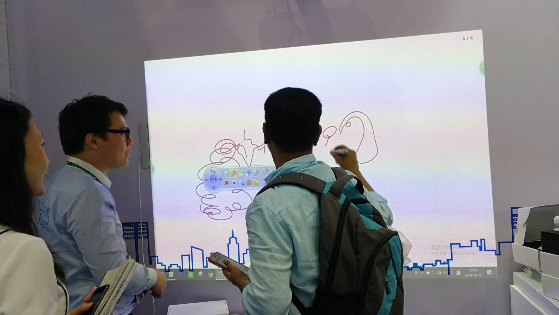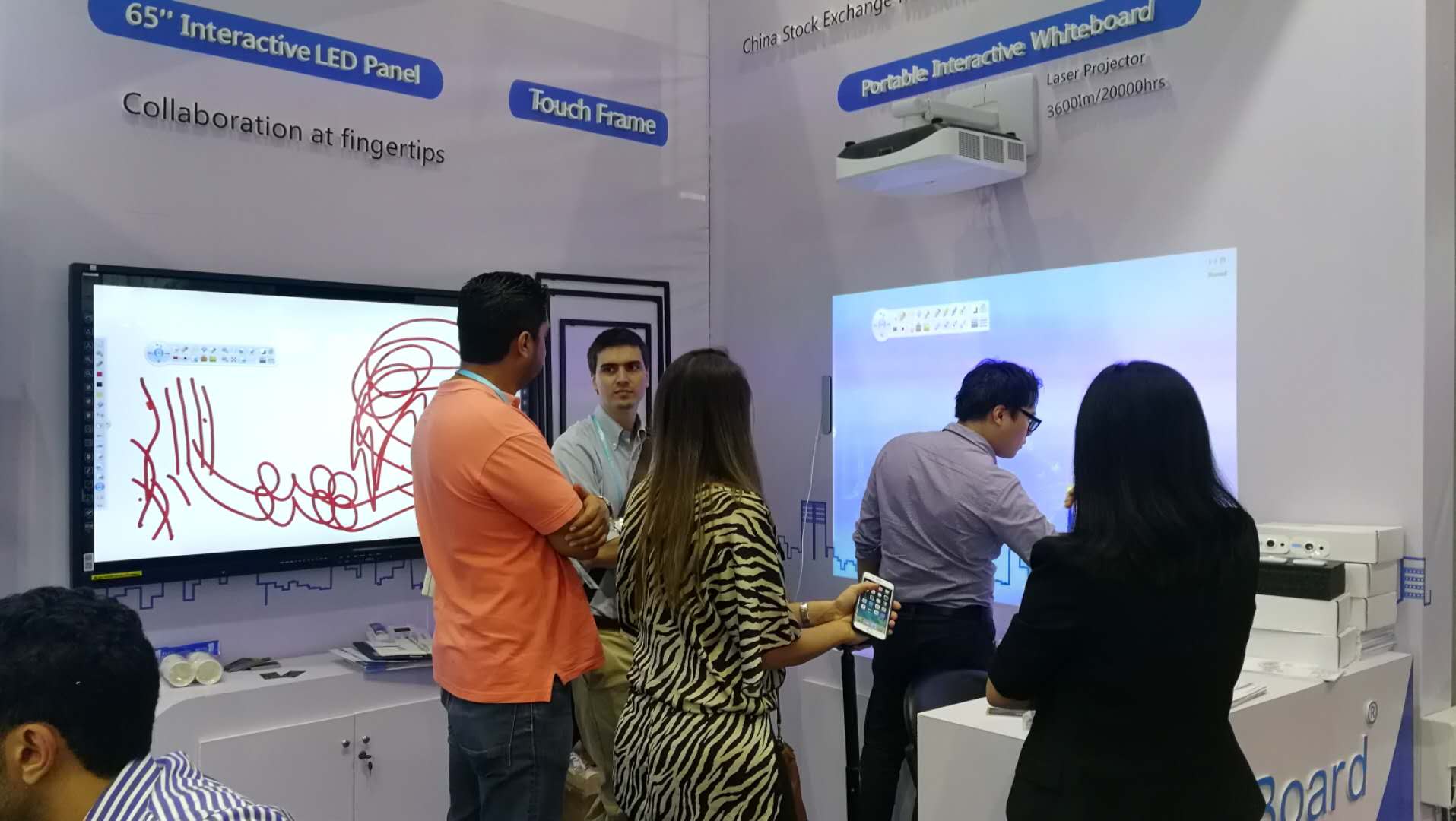便攜式電子(zǐ)白板展區更是吸引了眾(zhòng)多客戶前來體驗,而(ér)它的原理是將小(xiǎo)方盒接收器安裝在投影區域側邊中間位置,然(rán)後通過超聲波技術,捕捉電子筆書寫(xiě)的軌跡,就(jiù)能實現正常電子白板的功能了。它不僅輕巧便攜,還不會受地形影響,不論是在牆上還是在地板上,隻(zhī)要是平整的地方都能正常的(de)使用。