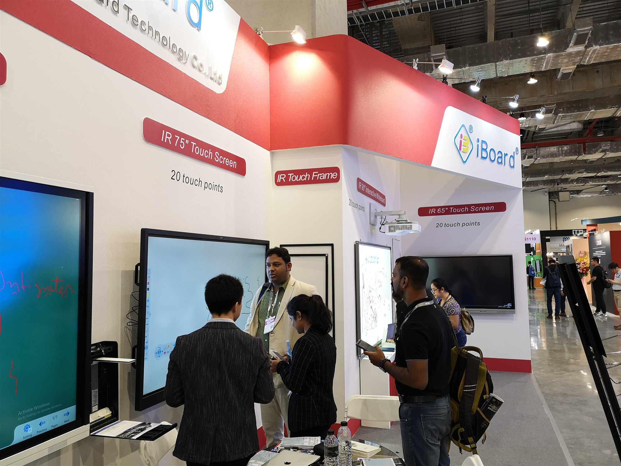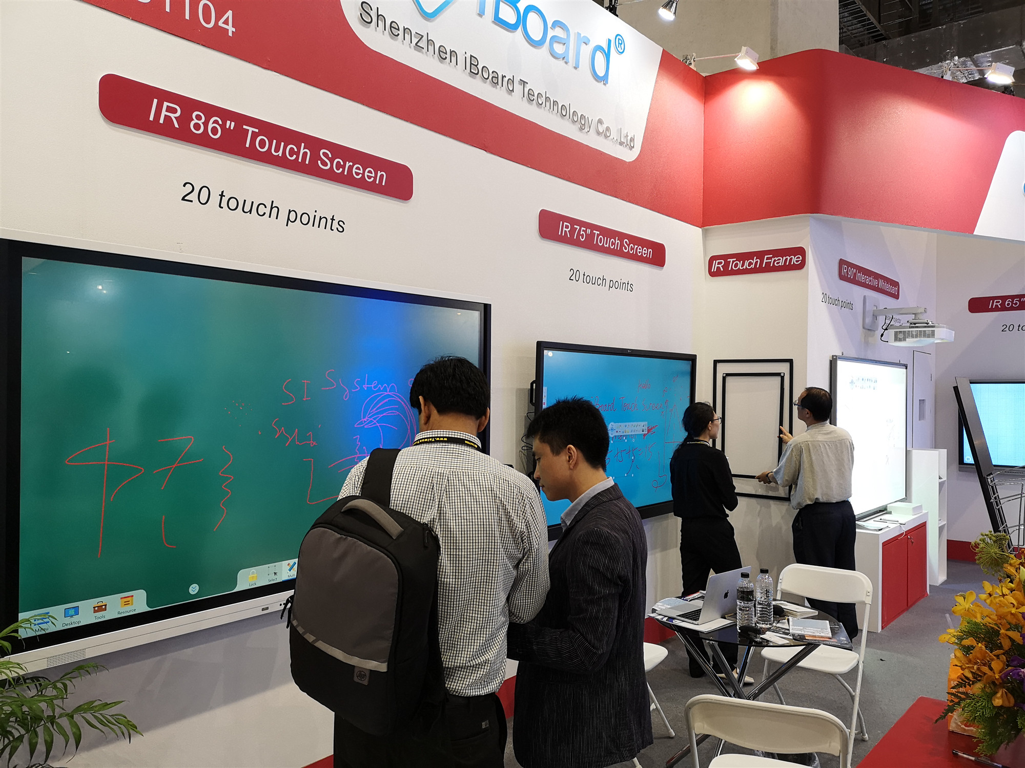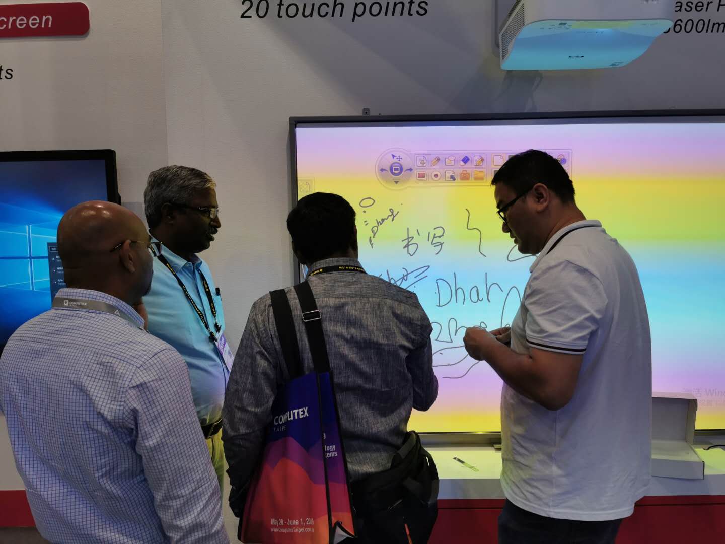 iBoard最新(xīn)款 90”交互式電子白板同時支持20點觸控,搭配純激光光源的超短焦激光投影機,色彩逼(bī)真豔麗、明亮清晰,節(jiē)能環保無毒無(wú)害,使用壽命高達20000小時,不存在更(gèng)換燈泡光源的問題,高效防塵,更加穩(wěn)定耐用,更易於安裝、管理(lǐ)。各種硬(yìng)件搭配DrawView白板教學軟件、大小屏互(hù)動軟件等組合而成的智慧教育教學環境更(gèng)是吸(xī)引現場(chǎng)觀眾紛紛前來體驗,不少(shǎo)客戶都表示(shì)艾博(bó)德的產品操作簡便,界麵友好,相比同類(lèi)教育產品更貼近實際需求!