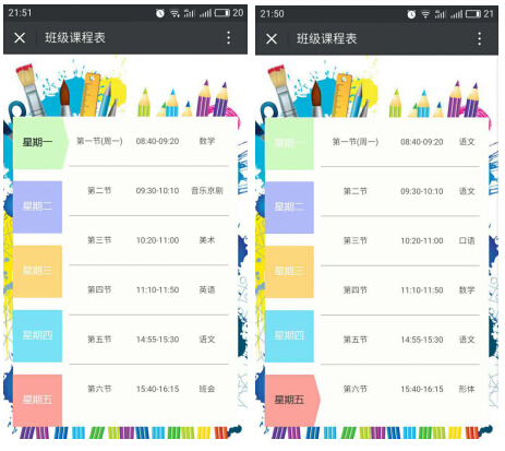 班級課程表形象的展示了(le)班級的課程安排及作息時間,學生/家長查詢課程表比傳統(tǒng)課表更加(jiā)方便。